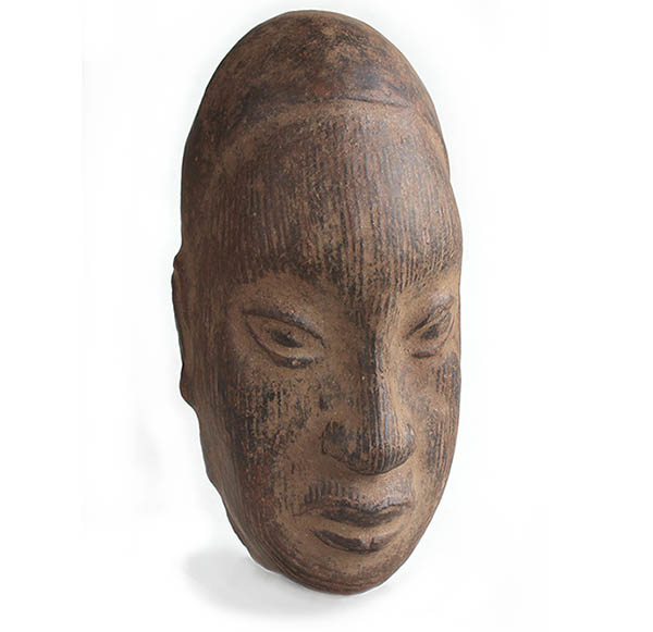 Der sehr längliche Kopf hat die für Ife typischen vertikalen Linien und ist im Mund-Nasebereich sehr naturalistisch ausgearbeitet. Die Augen, die bei diesem idealisierten Stil später horizontal gezeigt werden, sind sehr stilisiert und reduziert schräg nach oben. Der Kopf wurde innen von Erde befreit und ist hohl. |