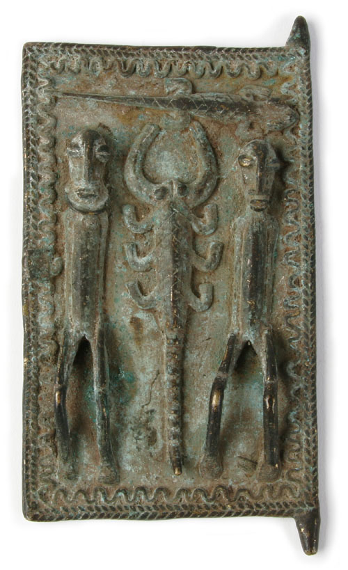 Diese kleine Bronzeplatte zeigt ein Figurenpaar, welches von reptilischen Darstellungen ergänzt wird. Links ist die bärtige Figur eines Mannes, rechts vermutlich die Figur einer Frau, obwohl keine typisch weiblichen Merkmale zu erkennen sind. Diese Figur könnte ebenso ein antropomorphes Wesen sein, die bei mehreren Kulturen der Sahel mit unsichtbaren Wesen in Verbindung gebracht werden. Stilistisch können drei Merkmale den Dogon zugeordnet werden: das ährenartige/geflochtene Dekor der Umrandung, die Ausführungen der Gesichter und die schmalen langgestreckten Oberkörper mit nahe am Körper liegenden Armen.