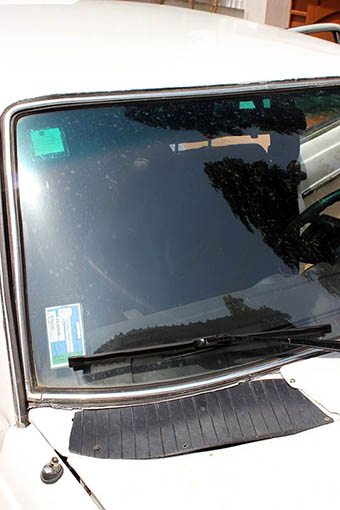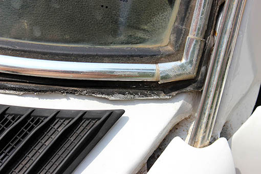 Die Zierleiste vom Dach entlang der Windschutzscheibe rechts löst sich auch. Eigentlich sind dort Löcher für drei Schrauben vorgesehen. Ist aber nur draufgesteckt und würde sich, ohne dass wir was machen, demnächst mit dem Fahrtwind nach hinten verabschieden. Vielleicht sogar einen dieser rücksichtlosen Mopedfahrer aufspießen.