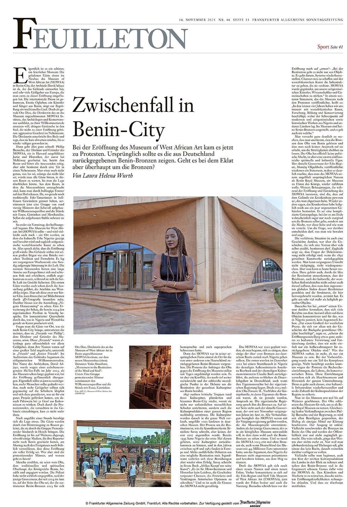 Und während ich dies hier schreibe, machte es Pling und ein Artikel der Frankfurter Allgemeinen Sonntagszeitung von Laura Helen Wurth kam herein. Die schreibt einen solch riegeldummen falschen Bockmist über das gerade eröffnete Museum in Benin-City zusammen, dass meine Wut richtige Ausmaße annimmt.