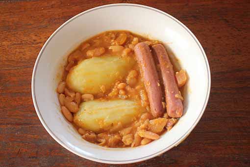 Hallalgeflügelwürstchen und weiße Bohnen vom Libanesen mit Kartoffeln aus Burkina Faso |