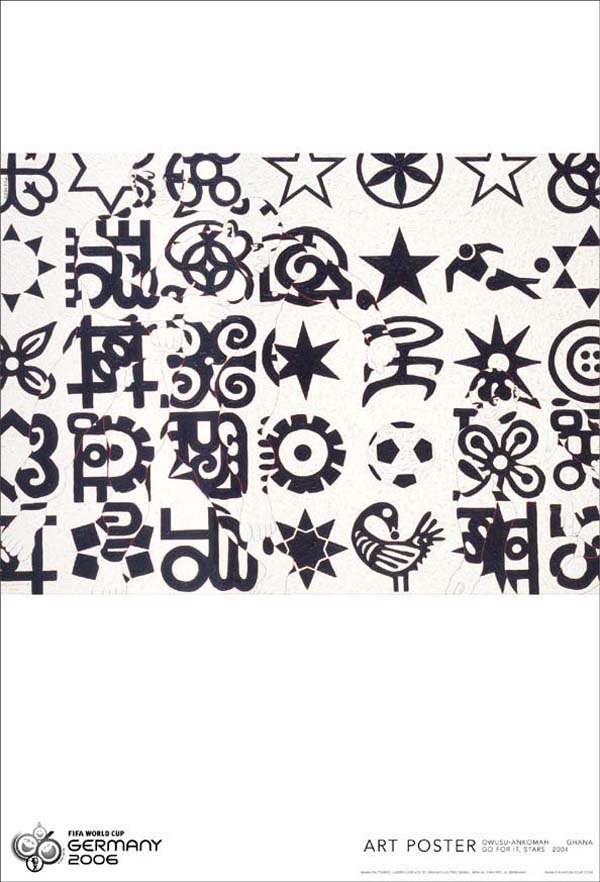 Das Original von Go for it, Stars wird versteigert und eine Druckedition aufgelegt, die weltweit parallel zur Fußballweltmeisterschaft vertrieben wird. Am 8.6.2006 wurde in München bei einem großen Empfang die Beteiligung offiziell bekannt gegeben. Owusu-Ankomah lernte dabei zu seiner großen Freude Franz Beckenbauer kennen und im Gespräch mit Innenminister Schily war natürlich Gesprächsthema, daß der Bruder Papa Owusu-Ankomah in Ghana ebenfalls Innenminister ist und wie Otto Schily vor einigen Jahren ebenfalls Sport- und Kulturminister war. Da so viel Gemeinsamkeit schnell Nähe schafft, hängt der erste Druck von Go for it, Stars in den Räumen des Bundesinnenministers. Wie ich erfahren konnte ebenso wie der Druck von Tobias Rehberger, der mit Owusu-Ankomah schon zweimal in der von Peter Herrmann kuratierten Ausstellung Around and Around zu sehen war. |